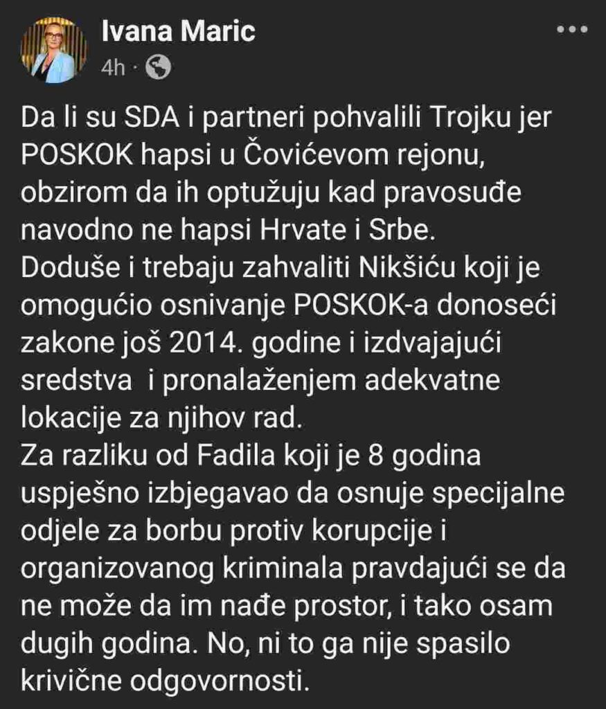 Za razliku od Fadila koji je 8 godina uspješno izbjegavao da osnuje specijalne odjele za borbu protiv korupcije i organizovanog kriminala pravdajući se da ne može da im nađe prostor, i tako osam dugih godina. No, ni to ga nije spasilo krivične odgovornosti.” – piše na svojoj FB stranici Ivana Marić, a kao komentar na članak pod naslovom “POSKOK “ujeda” po Hercegovini: …” objavljen na portalu Hercegovački.ba
