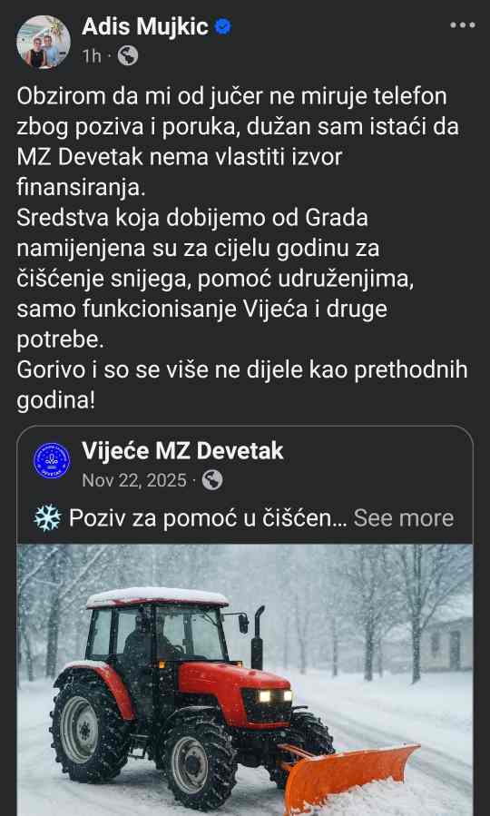 Predsjednik Mjesne zajednice Devetak je na svojoj Facebook stranici objavio kako mu od jučer ne prestaju pozivi i poruke građana u vezi raspodjele sredstava za čišćenje snijega. On je pojasnio da MZ Devetak nema vlastiti izvor finansiranja. Sredstva koja stižu iz Grada namijenjena su za cijelu godinu – za čišćenje snijega, podršku lokalnim udruženjima, funkcionisanje Vijeća i druge neophodne potrebe.