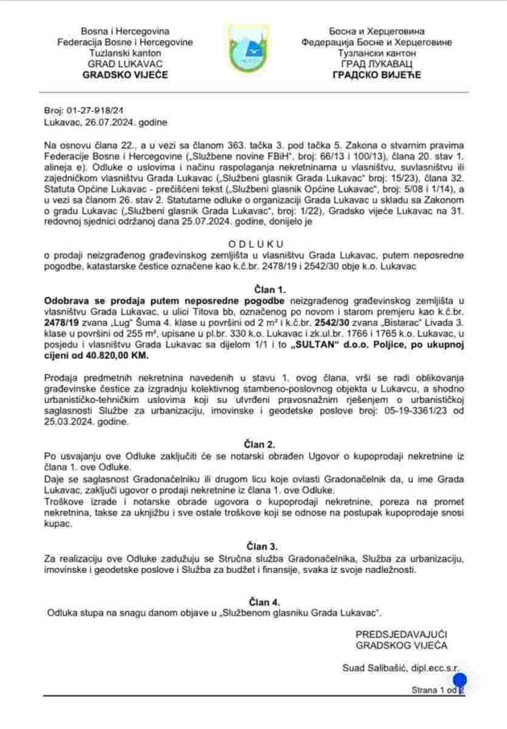 Reagujući na objavu načelnika Opštine Lukavac Edina Delića, advokat Nisad Omerović, koji zastupa građane, iznio je ozbiljne optužbe na račun opštinske vlasti. Omerović tvrdi da Delić obmanjuje javnost kada kaže da je Sultan d.o.o. parking kupio prije 27 godina, jer dokumentacija pokazuje drugačije. Prema njegovim riječima, Opština Lukavac je 26. jula 2024. godine prodala istoj firmi još dvije parcele – jednu od 255 m² i drugu od 2 m², čime je investitoru omogućena ukrupnjena parcela za gradnju.