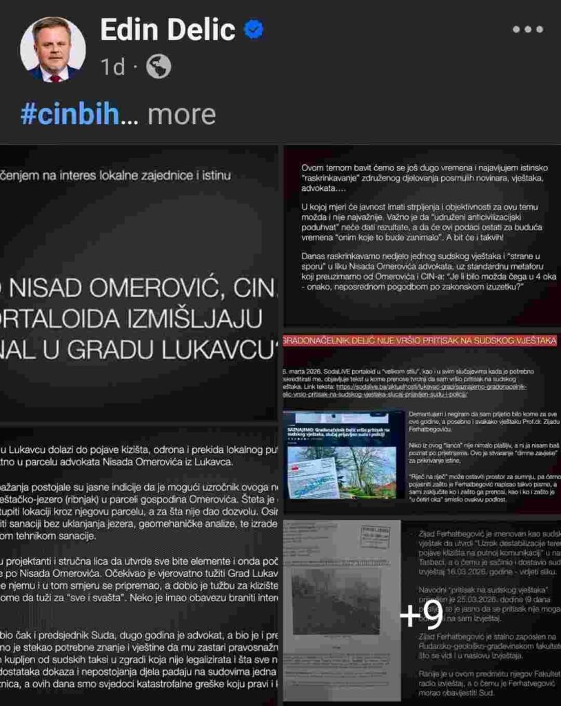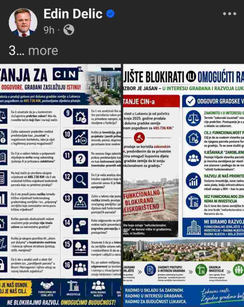 Juče, 20. aprila 2026. godine, gradonačelnik Lukavca Edin Delić objavio je čak šest statusa na svojoj Facebook stranici – svi u vezi sa istraživanjem koje je objavio Centar za istraživačko novinarstvo (CIN), a koje se bavi prodajom neizgrađenog građevinskog zemljišta.