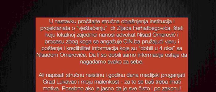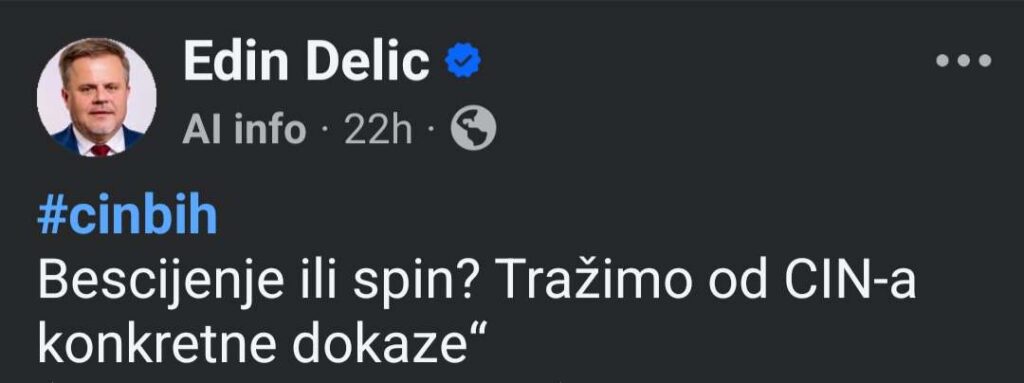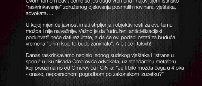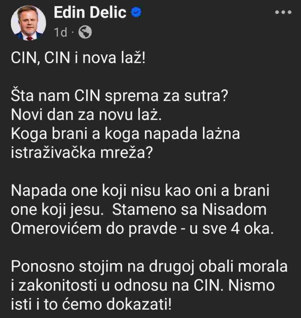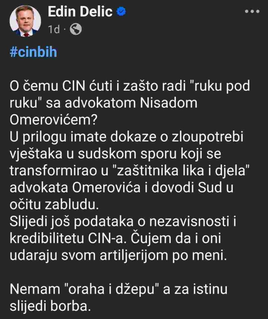– “O čemu CIN ćuti i zašto radi ‘ruku pod ruku’ sa advokatom Nisadom Omerovićem? … Slijedi još podataka o nezavisnosti i kredibilitetu CIN-a. Čujem da i oni udaraju svom artiljerijom po meni.”