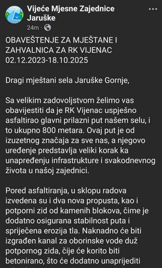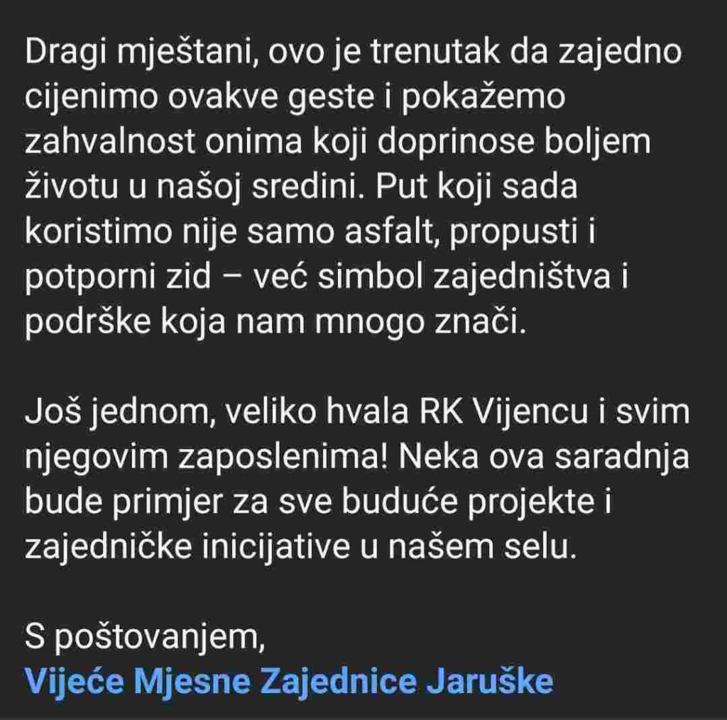Iz Vijeća MZ Jaruške poručuju da ovaj put nije samo nova asfaltna traka, već simbol zajedništva i međusobne podrške.