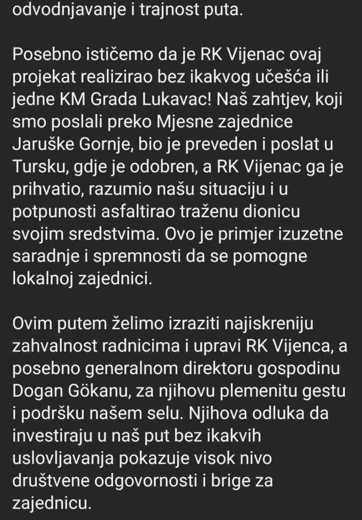 Iz Vijeća Mjesne zajednice Jaruške Gornje ističu da je RK “Vijenac” čitav projekat finansirao vlastitim sredstvima, bez ijedne marke iz budžeta Grada Lukavac. Prema njihovim navodima, zahtjev za rekonstrukciju puta upućen je preko mjesne zajednice i preveden na turski jezik, nakon čega je odobren i u potpunosti realizovan zahvaljujući razumijevanju i podršci kompanije iz Turske.