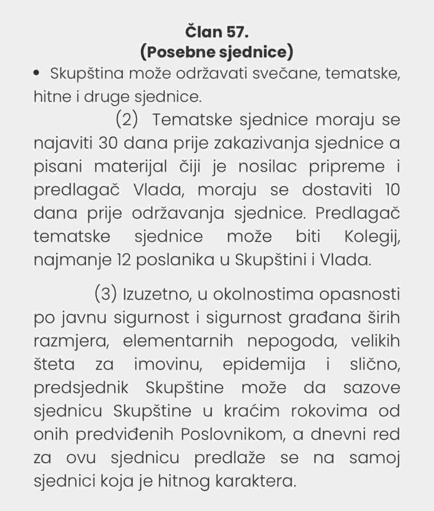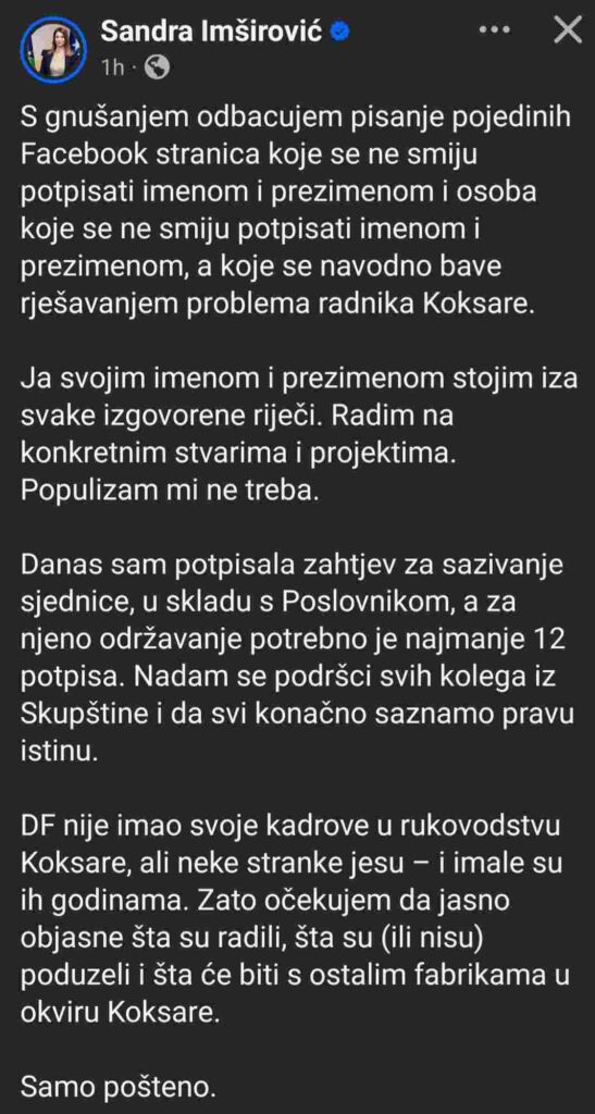 Zastupnica je dodala da je danas potpisala zahtjev za sazivanje sjednice Skupštine, naglašavajući da za njeno održavanje potrebno najmanje 12 potpisa. Kao prilog objavila je i dokument za koji vjerujemo da predstavlja njen zahtjev za sazivanje tematske sjednice, na čijoj trećoj stranici su mjesta predviđena za potpise.