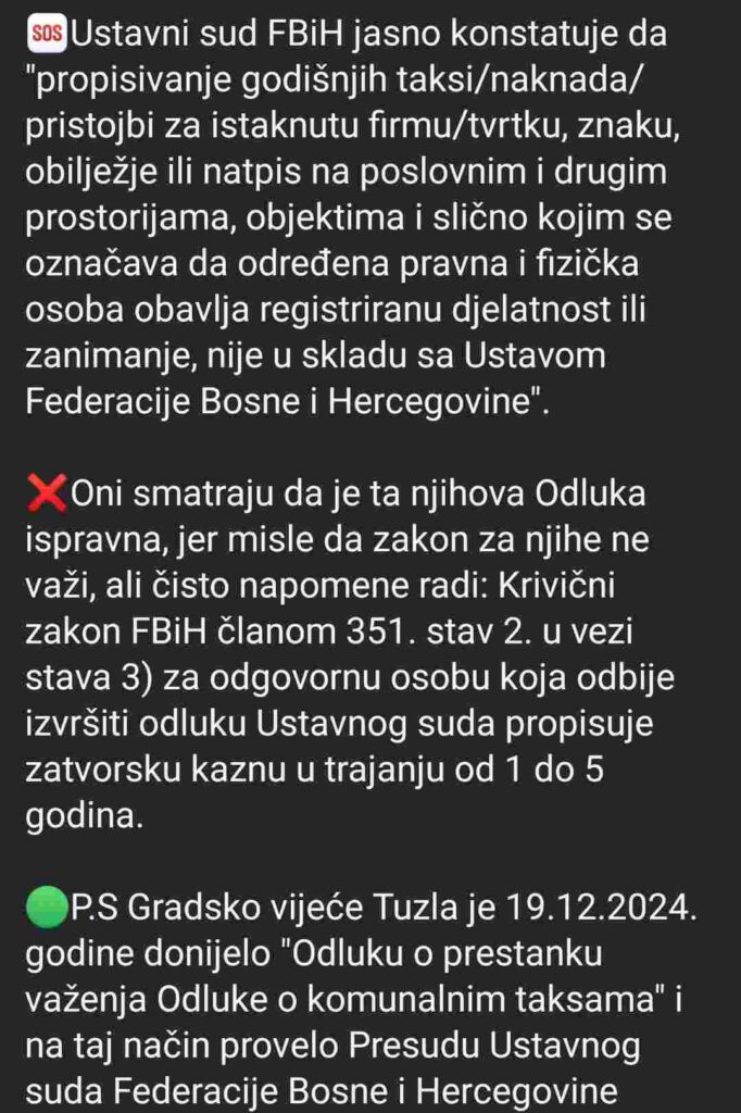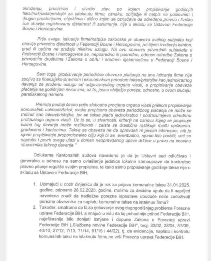 Ustavni sud FBiH je prethodno jasno iznio da “propisivanje godišnjih taksi/naknada/pristojbi za istaknutu firmu/tvrtku, znaku, obilježje ili natpis na poslovnim i drugim prostorijama, objektima i slično kojim se označava da određena pravna i fizička osoba obavlja registriranu djelatnost ili zanimanje, nije u skladu sa Ustavom Federacije Bosne i Hercegovine”.