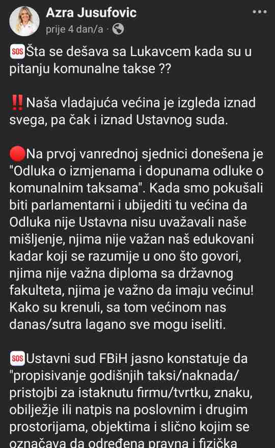 Vijećnica SDA u Gradskom vijeću Lukavac, Azra Jusufović, oglasila se na društvenim mrežama povodom novogodišnjih izmjena Odluke o komunalnim taksama koje je usvojila vladajuća većina u Lukavcu. U objavi na Facebooku, Jusufović je izrazila zabrinutost zbog činjenice da vlast u Lukavcu nastavlja ignorisati odluke Ustavnog suda Federacije BiH, što bi moglo imati ozbiljne pravne posljedice.