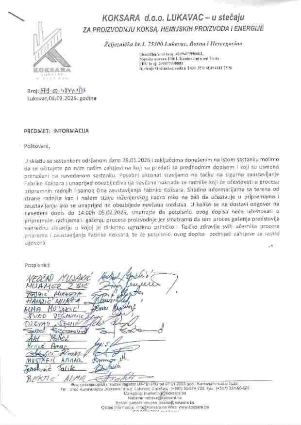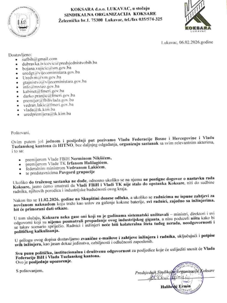 U dopisu od 06.02.2026. godine Sindikat Koksare Lukavac upućuje posljednji hitan poziv premijeru Vlade FBiH Nerminu Nikšiću, premijeru Vlade TK Irfanu Halilagiću, ministru Vedranu Lakiću i predstavnicima Pavgord grupacije.