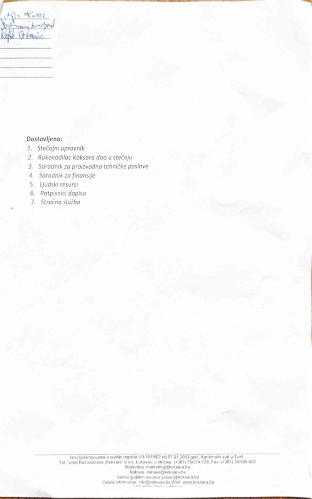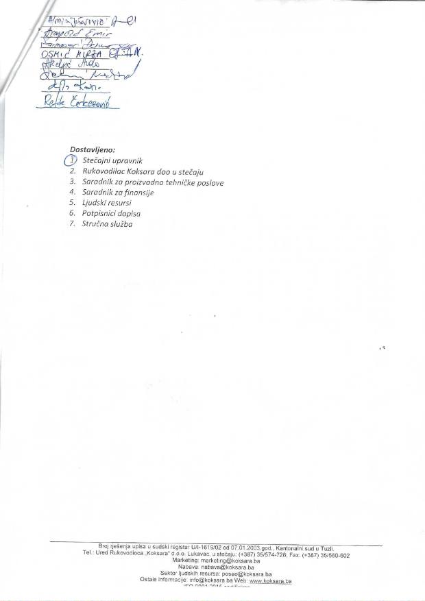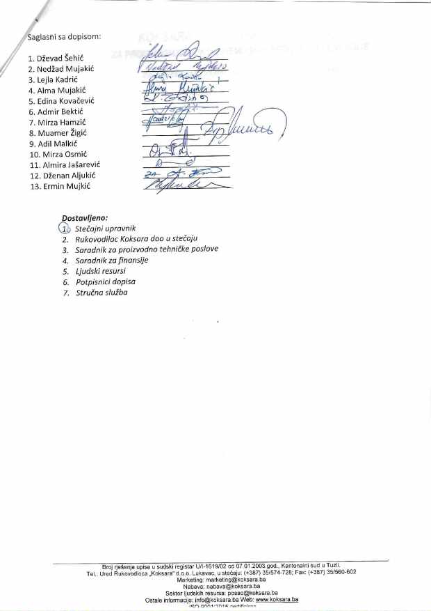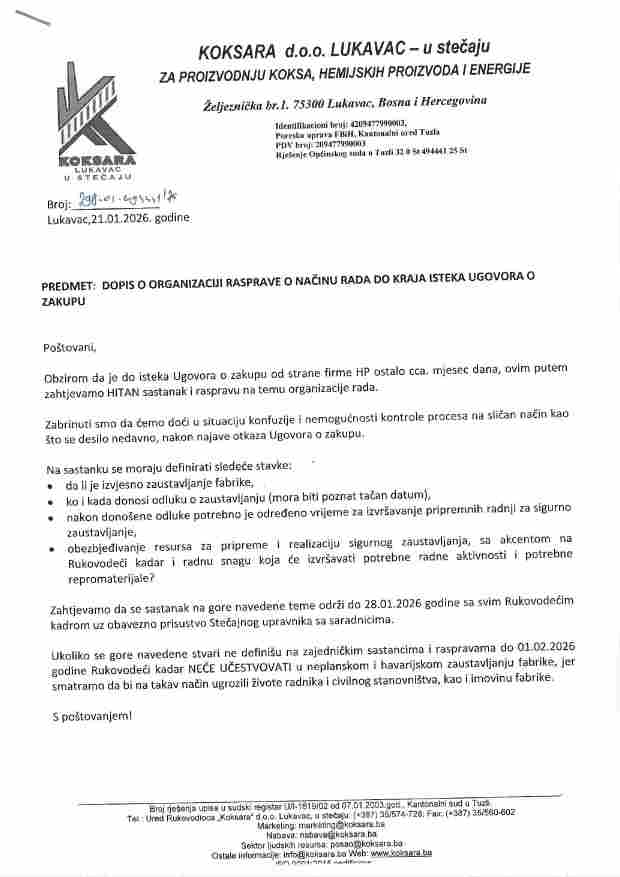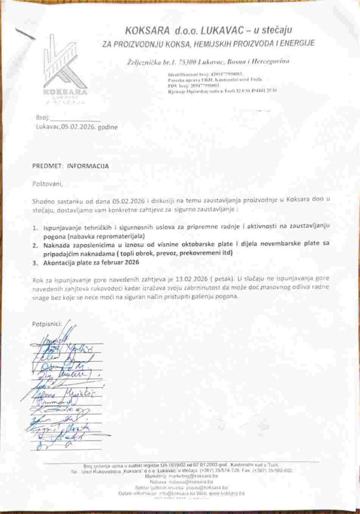 Dan kasnije, nakon novog sastanka, upućen je dopis sa konkretnim zahtjevima za sigurno zaustavljanje proizvodnje u Koksari Lukavac u stečaju: