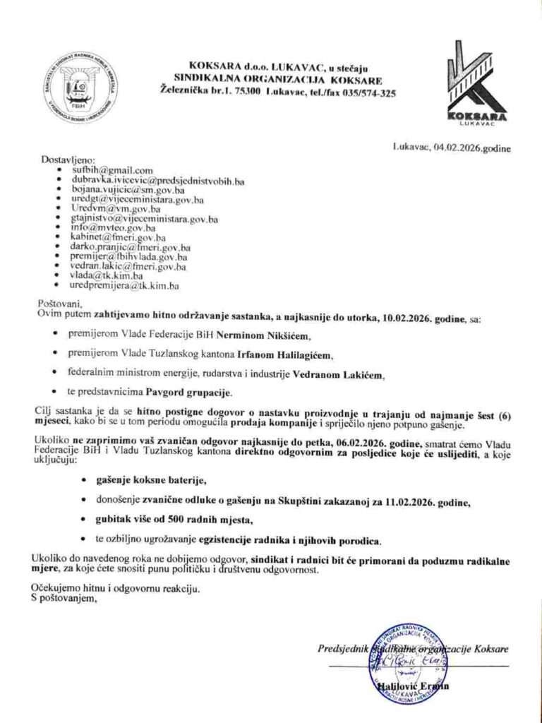 Sindikat Koksare uputio je danas zvaničan zahtjev za hitnim sastankom s premijerom Vlade Federacije BiH Nerminom Nikšićem, premijerom Vlade Tuzlanskog kantona Irfanom Halilagićem, federalnim ministrom energije, rudarstva i industrije Vedranom Lakićem, te predstavnicima Pavgord grupacije.