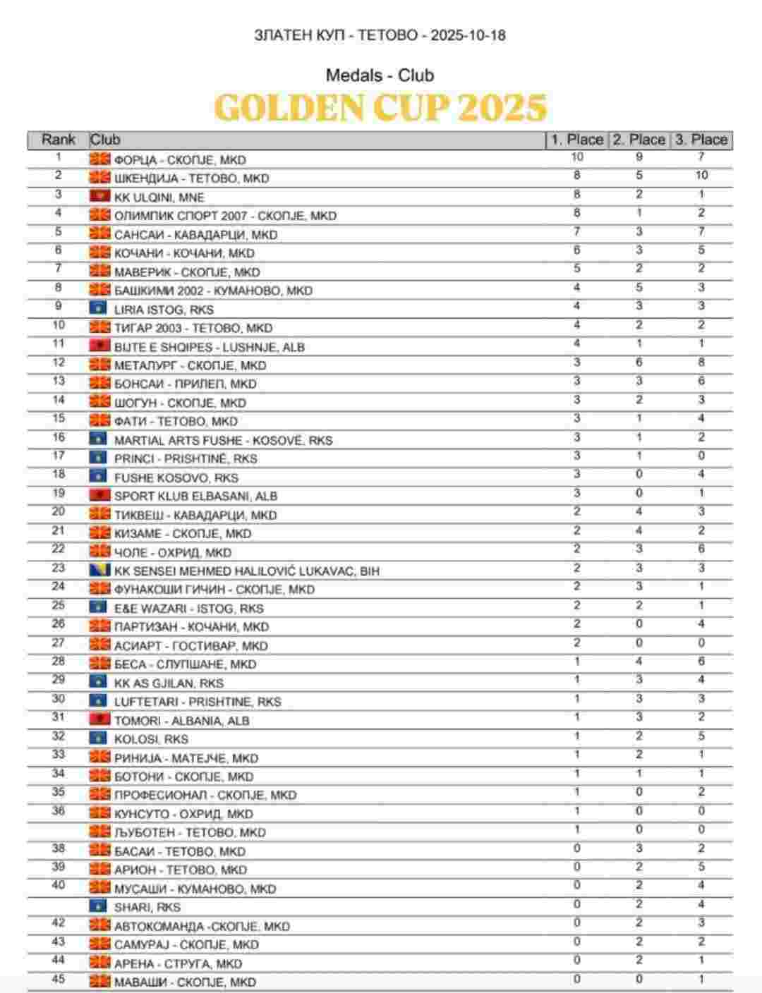 U subotu, 18. oktobra 2025. godine, osam najboljih takmičara kluba nastupilo je na Internacionalnom turniru „Golden Cup“ u Tetovu, koji je okupio učesnike iz 12 država regiona.