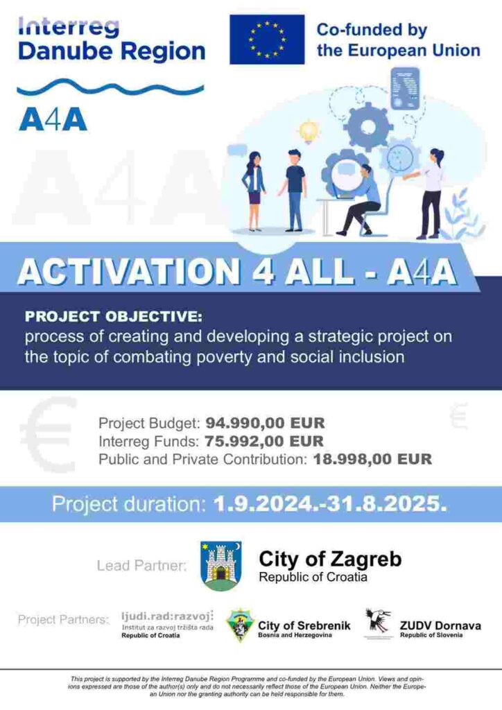 Projekat Activation 4 All realizuje se u partnerstvu Grada Zagreba (Hrvatska), Grada Srebrenika (BiH), Instituta za razvoj tržišta rada (Hrvatska) i Zavoda Dornava (Slovenija). Projekat je finansiran kroz Interreg Danube Transnational Programme – Seed Money Facility, koji podržava razvoj strateških inicijativa usmjerenih na unapređenje socijalne uključenosti u zemljama dunavskog regiona.