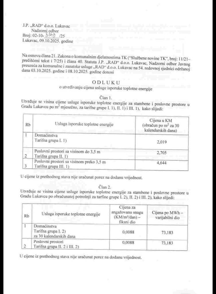 „Nakon povećanja cijene energije iz Termoelektrane, Tuzla je cijenu grijanja povećala sa 1,44 KM na 1,73 KM po m² (bez PDV-a). U Lukavcu, međutim, građani plaćaju 2,362 KM po m², što je znatno više za istu toplotnu energiju.“
