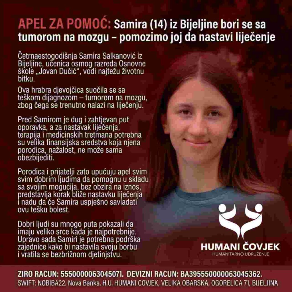 Humanitarno udruženje „Humani Čovjek“ pokrenulo je akciju pomoći za 14-godišnju Samiru Salkanović iz Bijeljine, koja se suočava s teškom bolešću i vodi jednu od najtežih životnih bitaka.