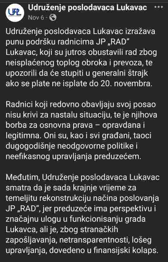 Podsjetimo, posljednja objava Udruženja od 6. novembra bila je veoma jasna, konkretna i oštra. Tada su poručili da “radnici JP ‘RAD’ nisu krivi za nastalu situaciju”, da je njihov “protest opravdan i legitiman”, te su ukazali na dugogodišnje probleme lošeg upravljanja, stranačkog zapošljavanja i netransparentnog poslovanja. Tražili su hitne mjere, racionalizaciju i rekonstrukciju sistema, naglašavajući da su otvoreni za saradnju.