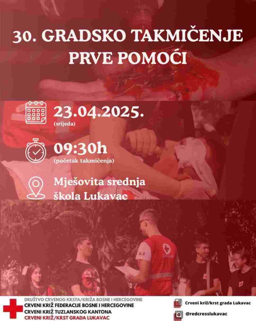 Crveni križ/krst grada Lukavac s ponosom najavljuje jubilarno 30. Gradsko takmičenje iz pružanja prve pomoći, koje će se održati u srijedu, 23. aprila 2025. godine, s početkom u 09:30 sati. Domaćin ovogodišnjeg takmičenja je Mješovita srednja škola Lukavac, koja će ugostiti takmičarske ekipe iz osnovnih i srednjih škola s područja cijelog grada.