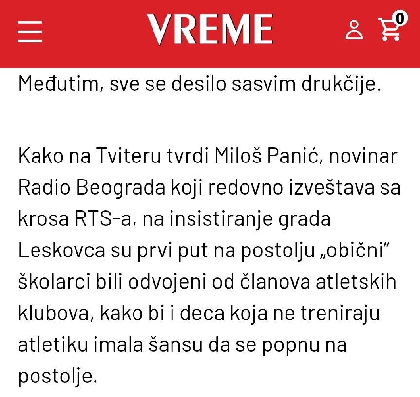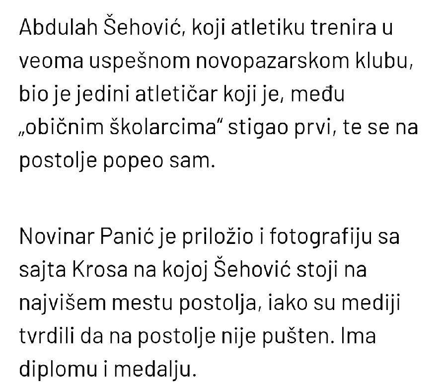Na Krosu RTS-a u Leskovcu mali Abdullah Šehović ostvario je nevjerovatnu pobjedu, ali njegova radost brzo je prerasla u razočaranje. Iako je osvojio prvo mjesto i dobio diplomu i medalju, Abdullah nije bio pozvan na pobjedničko postolje, niti je spomenut u programu. Ova situacija izazvala je buru reakcija, posebno u Sandžaku, gdje se ovaj čin doživljava kao sramotan i ponižavajući.