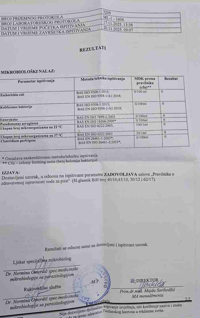 Prema rezultatima izvršenih analiza, nisu utvrđena nikakva odstupanja od propisanih standarda za vodu za piće, te je ona sigurna za konzumaciju i svakodnevnu upotrebu.
