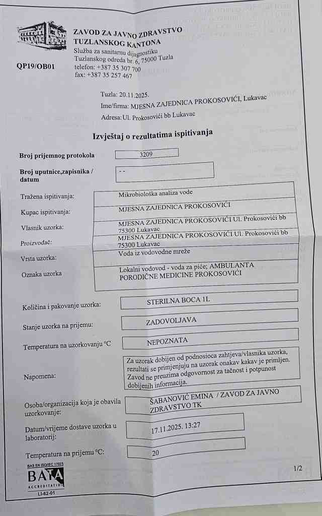 Vijeće Mjesne zajednice Prokosovići, u cilju zaštite zdravlja svojih mještana, uzelo je uzorak vode sa vodovodne mreže i dostavilo ga na laboratorijsku kontrolu u Zavod za javno zdravstvo Tuzlanskog kantona, gdje je utvrđeno da je voda u potpunosti zdravstveno ispravna.