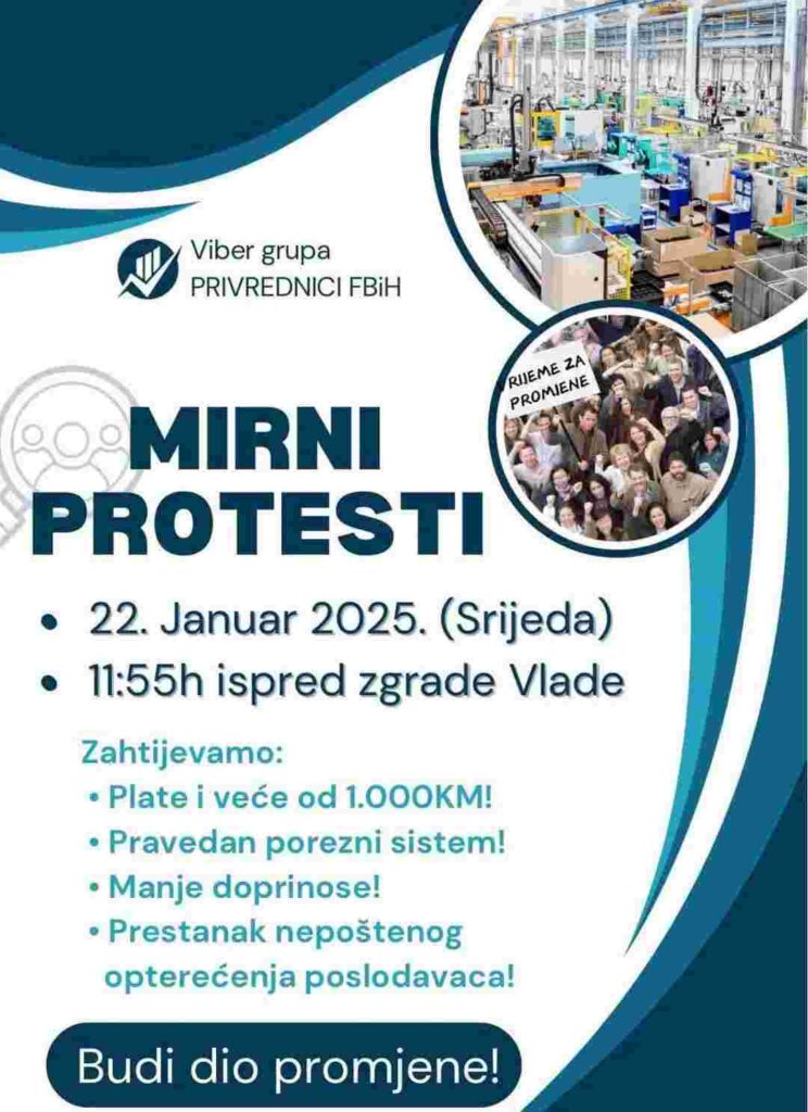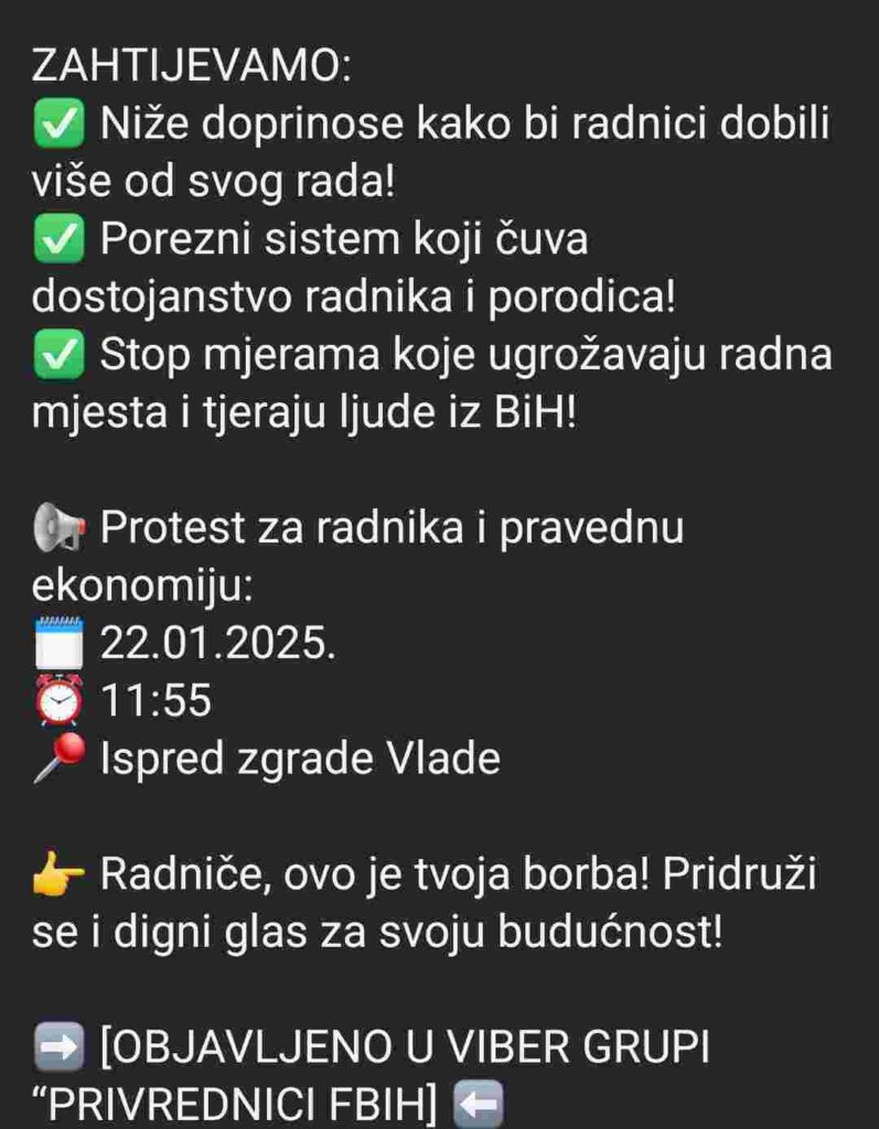 Poziv na protest zakazan je za 22. januar 2025. godine, ispred zgrade Vlade FBiH. Ako je suditi po retorici organizatora, izgleda da su poslodavci i njihovi simpatizeri u “Gradačačkom Glasu” spremni uvjeriti radnike kako je borba za njihova prava zapravo prijetnja njihovom opstanku.