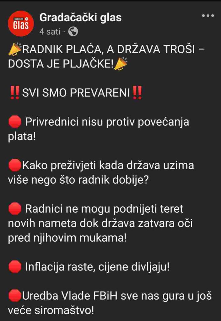 Zamislite apsurd: na zvaničnoj Facebook stranici web portals “Gradačački Glas“, glasila lokalnog SDA-a, osvanula je objava u kojoj poslodavci pozivaju radnike da protestvuju protiv povećanja plata. Da, dobro ste pročitali – protiv povećanja vlastitih plata!