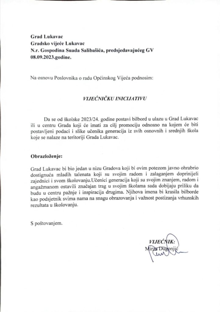 Još davne 2023. godine tadašnji gradski vijećnik Mirza Dugonjić uputio je inicijativu kojom je predložio da Grad Lukavac, počevši od školske 2023/24. godine, na ulazu u grad ili u samom centru postavi bilbord sa slikama i imenima učenika generacija iz svih osnovnih i srednjih škola s područja Grada. Cilj inicijative bio je jasan – promovirati uspjeh, zalaganje i trud mladih ljudi te ih javno istaknuti kao primjere za sve ostale.