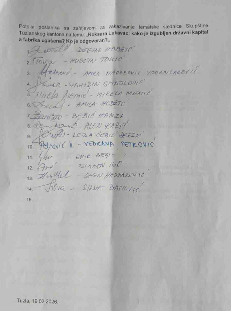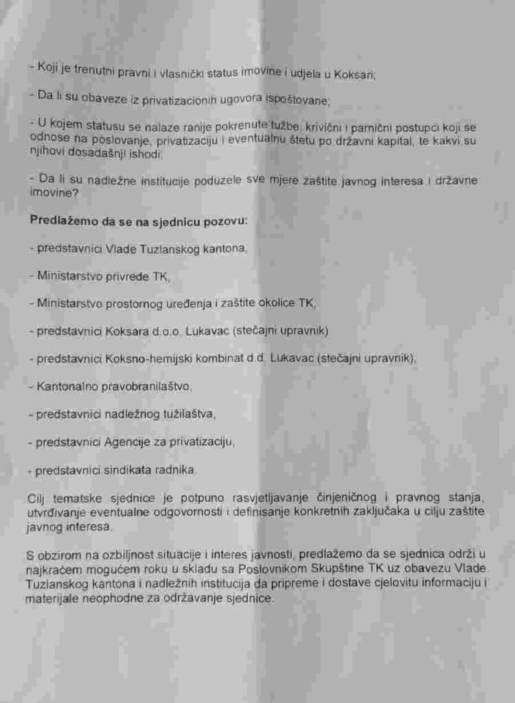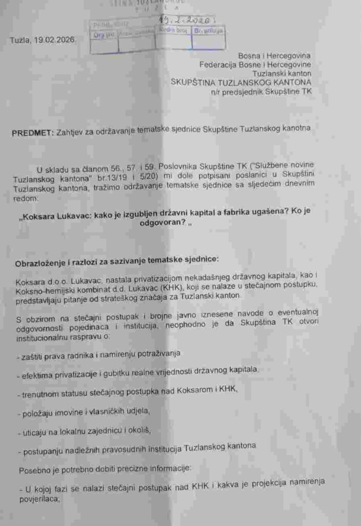 Juče je na protokol Skupštine Tuzlanskog kantona predat zahtjev poslanika za sazivanje tematske sjednice na temu Koksara Lukavac: kako je izgubljen državni kapital a fabrika ugašena i ko je odgovoran.