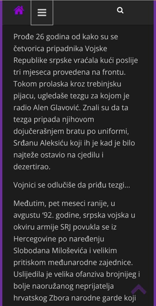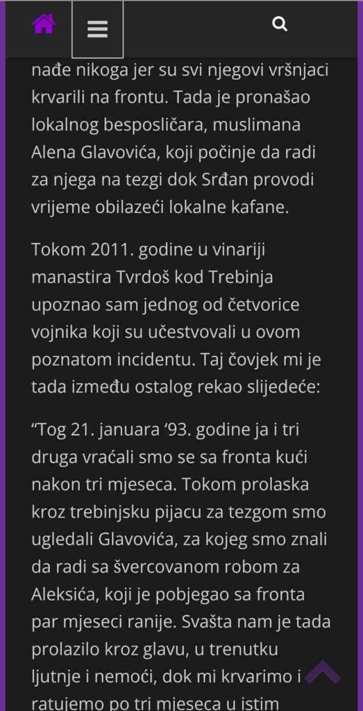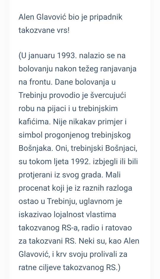 Takođe, piše da je i Alen Glavović bio pripadnik VRS, te da je u vrijeme tih dešavanja bio na odsustvu zbog bolovanja nakon ranjavanja, kao i fotografija za koju se tvrdi da je na njoj Alen Glavović kao pripadnik Trebinjske brigade VRS koji daje intevju za RTS 1.