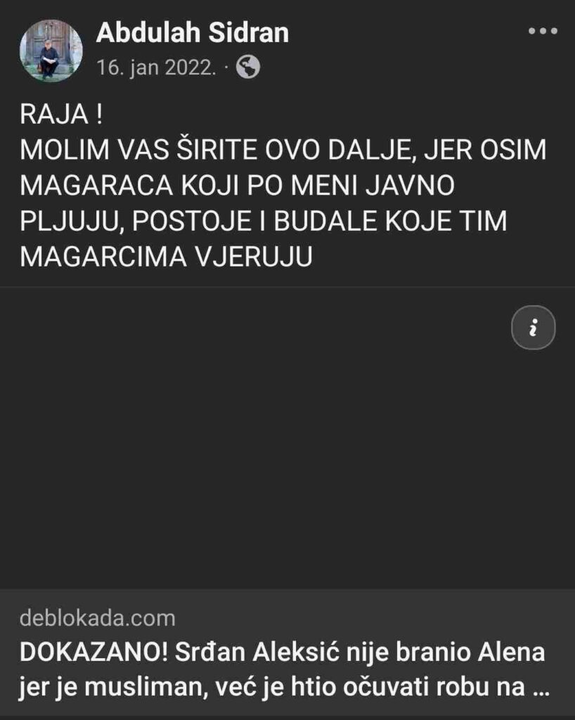 Takođe, Sidran je 2023. godine, na svom profilu podijelio, sada već obrisan članak web portala “Deblokada”, od 20.01.2020. godine, pod naslovom: “DOKAZANO! Srđan Aleksić nije branio Alena jer je musliman, već je htio očuvati robu na svojoj tezgi”.