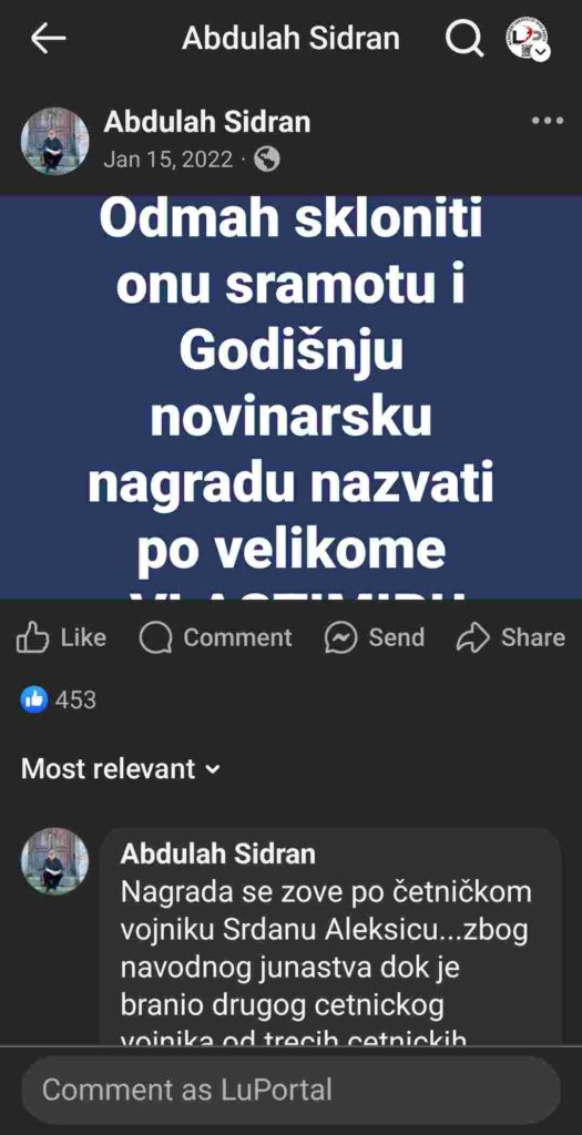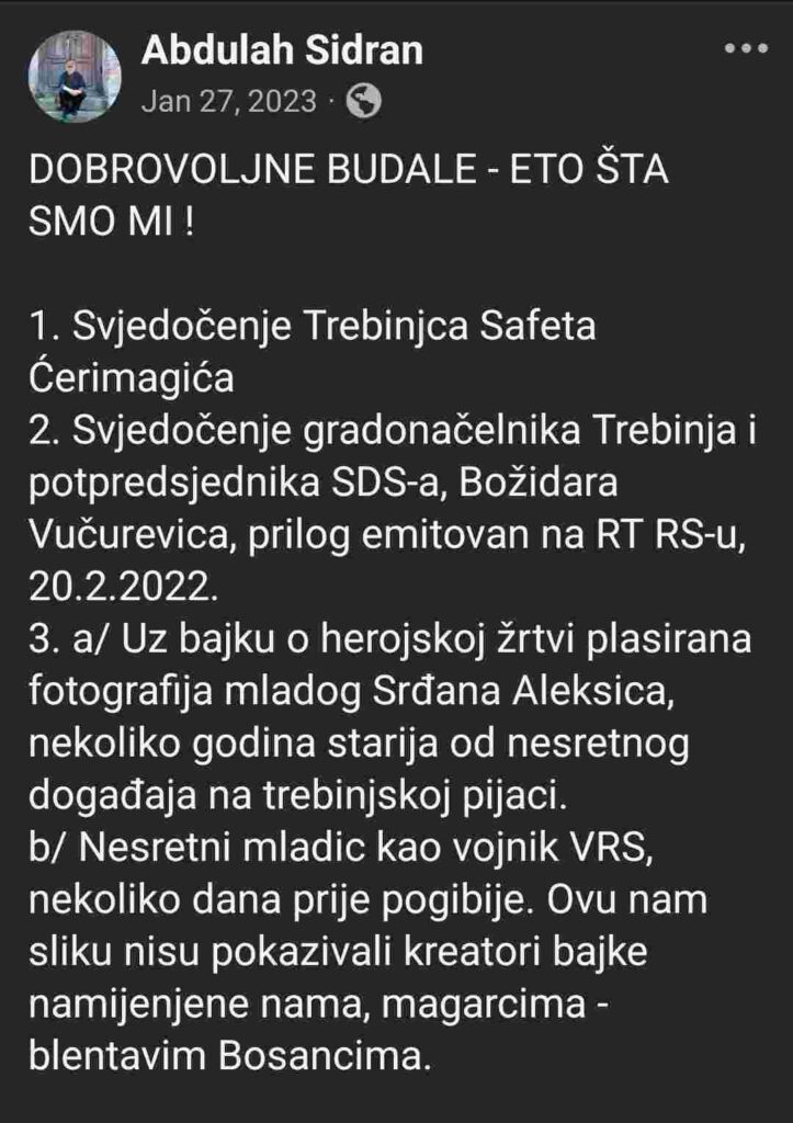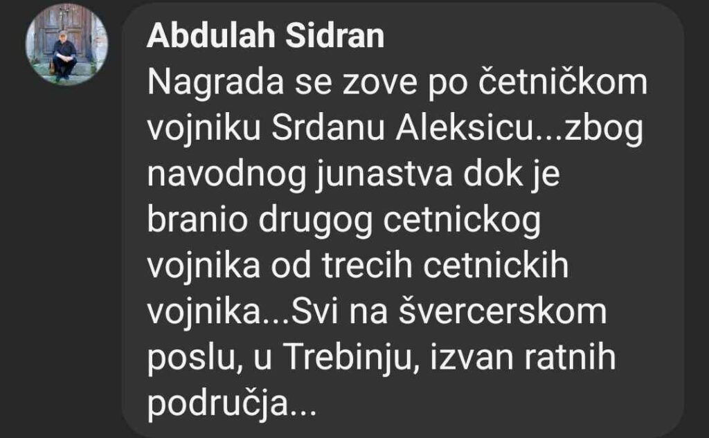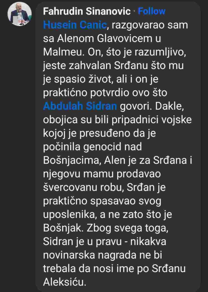 U komentaru na taj Sidranov post, novinar i književnik Fahrudin Sinanović, napisao je: