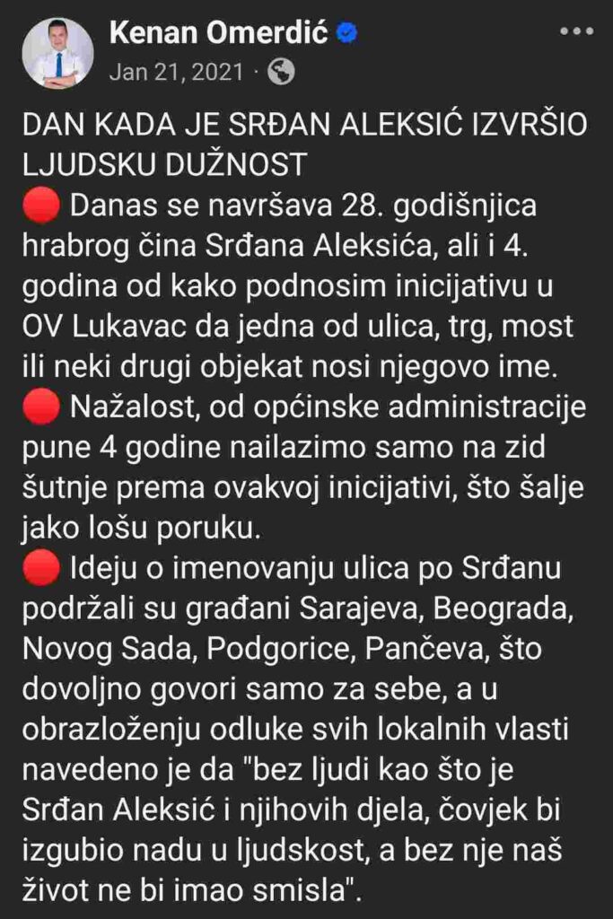 Pa zašto je SDP-u u Lukavcu toliko stalo da srpski borac koji je branio srpskog borca – koji je bio njegov radnik za ratno-švercerskim štandom, dobije svoju ulicu u Lukavcu, dok na primjer, ulicu nema prvi opštinski načelnik Lukavca, Sead Hasanhodžić?