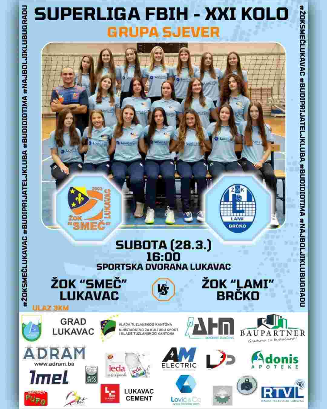 Odbojkašice ŽOK “Smeč” Lukavac u subotu 28.03.2026. godine igraju svoju posljednju domaću utakmicu u tekućoj sezoni, a protivnik će im biti ekipa iz Brčkog u okviru XXI kola Superlige FBiH Sjever.