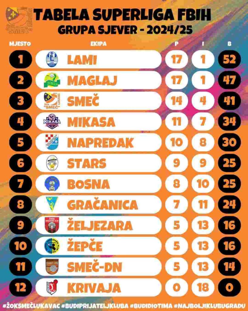 Nakon 18 odigranih kola u sezoni 2024/25, odbojkašice ŽOK “Smeč” Lukavac nalaze se na trećem mjestu prvenstvene tabele s osvojenih 41 bodom. Ekipu do kraja sezone očekuju još četiri susreta, a posebno ohrabruje činjenica da će tri od njih odigrati pred domaćom publikom, što im daje priliku da dodatno učvrste svoju poziciju među vodećim timovima.